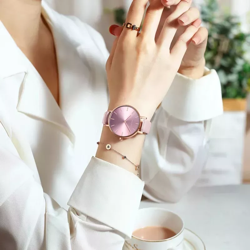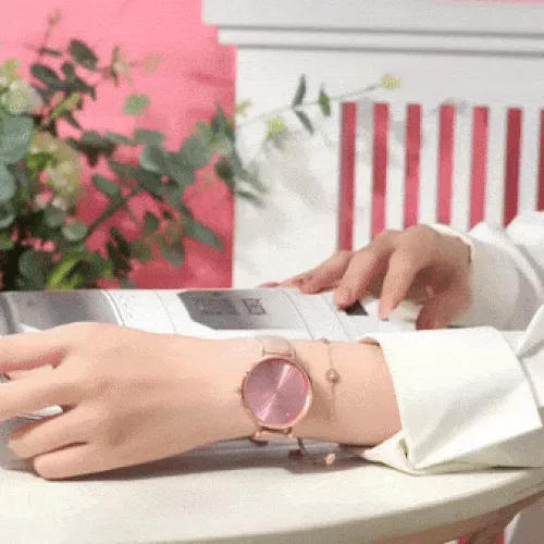 Effortless Style: Featuring a chic pink quartz dial paired with a sleek leather strap, this watch is the epitome of effortless style. Its minimalist design ensures it pairs well with everything from your business suits to weekend casuals.