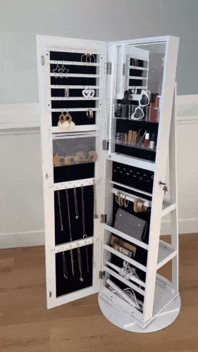 Our Jewelry Armoire stands out with its modern style, practicality, and convenience. Perfect for use in bedrooms, dressing rooms, or wherever you prepare for your day, it offers a special blend of elegance and functionality. The automatic LED lights add a touch of luxury, making this armoire not just a piece of furniture but a dressing experience. Whether you’re getting ready for work, a night out, or simply choosing your daily accessories, this armoire meets all your needs with style and sophistication.
