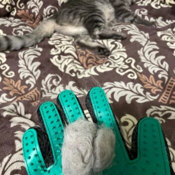 i couldn’t be happier with this grooming glove. it’s made grooming sessions with my pet so much more enjoyable and effective. the glove fits comfortably on my hand, and the soft bristles do an excellent job of removing loose fur and dirt. my pet actually seems to enjoy the grooming process now, often purring contentedly as i use it. it’s also great for giving my pet a gentle massage, which they absolutely love. the glove is easy to clean; the hair peels off effortlessly, and it dries quickly after a rinse. i’ve noticed a significant decrease in the amount of shedding around the house, which is a huge plus. the glove is well-made and durable, showing no signs of wear even after several uses. it’s a great investment for any pet owner looking to make grooming a pleasant experience for both themselves and their pets. highly recommend!