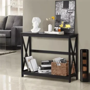 Elegant 2-Tier Black Wood Console Table with X Design and Storage Shelf